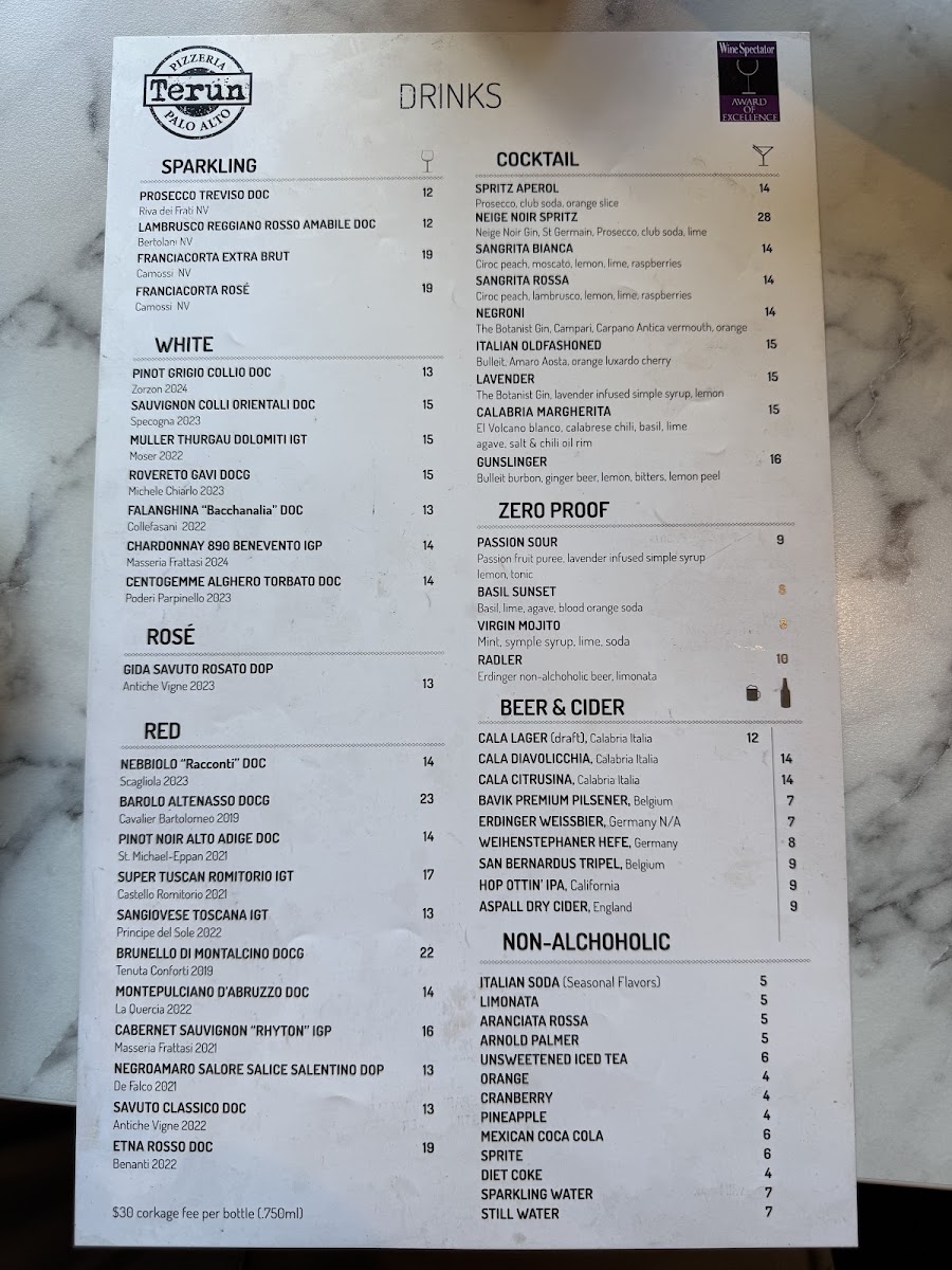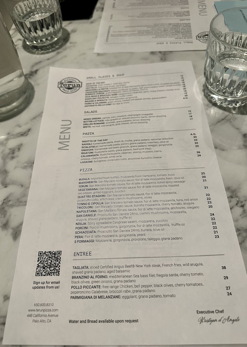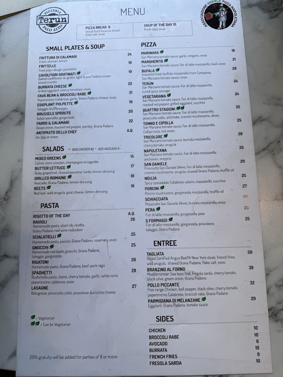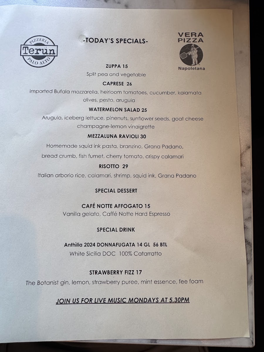 Pizza: The pizza offerings feature traditional Italian styles with toppings ranging from the classic Marinara and Margherita to specialty pies like Bufala Pizza topped with buffalo mozzarella and the Terun with cured spicy sausage. Vegetarian options such as the Vegetariana pizza are also available. The pizzas emphasize thin Italian-style crusts prepared with quality ingredients.